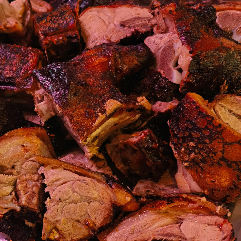 Roasted Pork with leaves and fresh myrtle berries on a bed of toasted bits of carasau bread € 39,95 per Kg