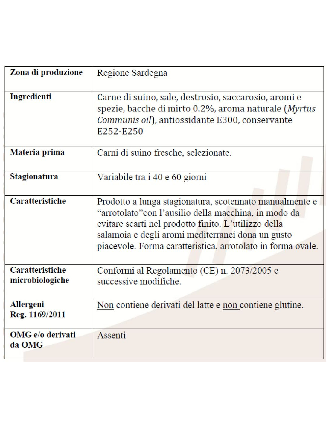 Pork meat, salt, dextrose, sucrose, flavorings and spices, myrtle berries 0.2%, natural flavoring (Myrtus Communis oil), antioxidant E300, preservatives E252–E250.