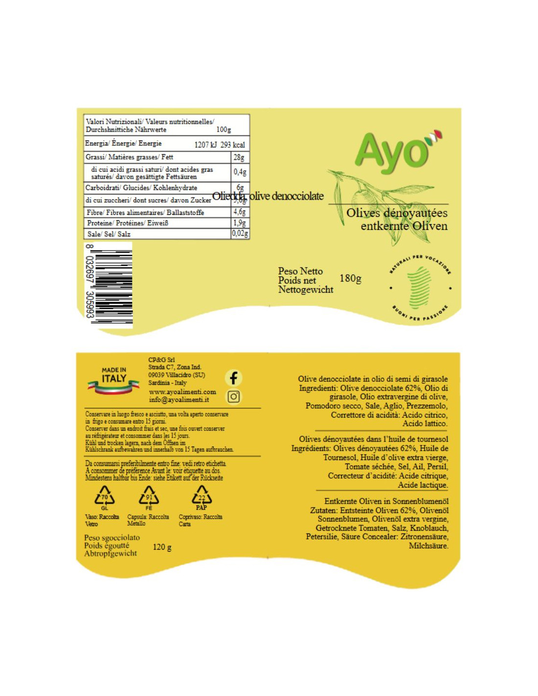 Small pitted olives, harvested at the perfect stage of ripeness, are seasoned and preserved in oil. They are excellent for enjoying as an aperitif or as an appetizer. They are also perfect for dressing cold pasta or rice salads and as ingredients in flavorful sauces and main dishes.