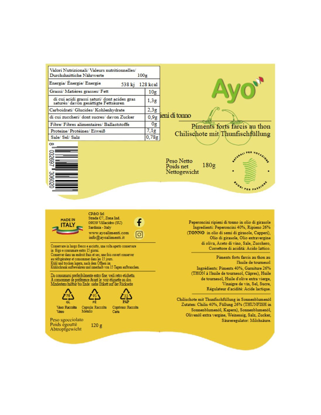 Red chili peppers 38%, stuffing 25% (TUNA IN SUNFLOWER OIL, capers),