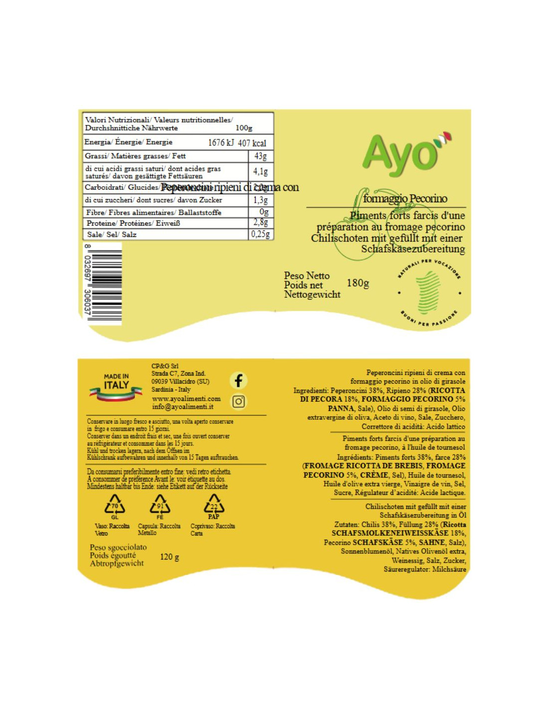 Chili Peppers 38%, Filling 28% (RICOTTA, Sunflower Oil, PECORINO CHEESE 5%, CREAM, Salt), Sunflower Seed Oil, Extra Virgin Olive Oil, Wine Vinegar, Salt, Sugar. Acidity regulator: Lactic acid.