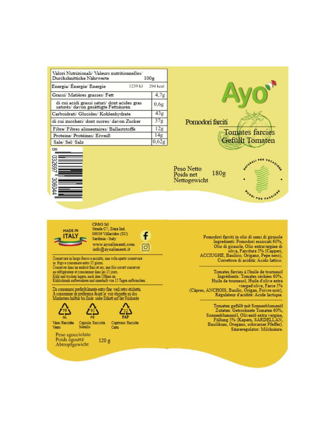 Dried and rehydrated tomatoes 60%, sunflower seed oil, extra virgin olive oil, filling 5% (capers, ANCHOVIES, basil, oregano, black pepper). Acidity regulator: lactic acid.