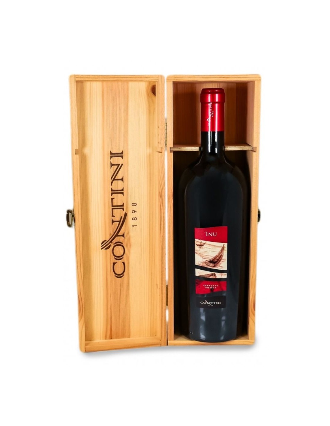Un tempo, ‘Inu era il nome dato ai vini più importanti nati nel cuore della Sardegna. È questo il nome che la Cantina Contini ha voluto dare a questo Cannonau Riserva: un vino semplicemente unico, che vivrà per sempre, come i veri eroi che trascendono il passare del tempo. Cannonau di Sardegna DOC Riserva. All’occhio risulta di un colore rosso rubino che scivola verso sfumature granata, dal profumo intenso con note di prugna matura e more selvatiche. Al palato il sapore risulta pieno, strutturato, di lunga persistenza. Ottimo da consumare a tutto pasto, da accompagnare a grandi arrosti, selvaggina e formaggi piccanti. Nella versione in formato magnum viene venduta con cassetta di legno originale.