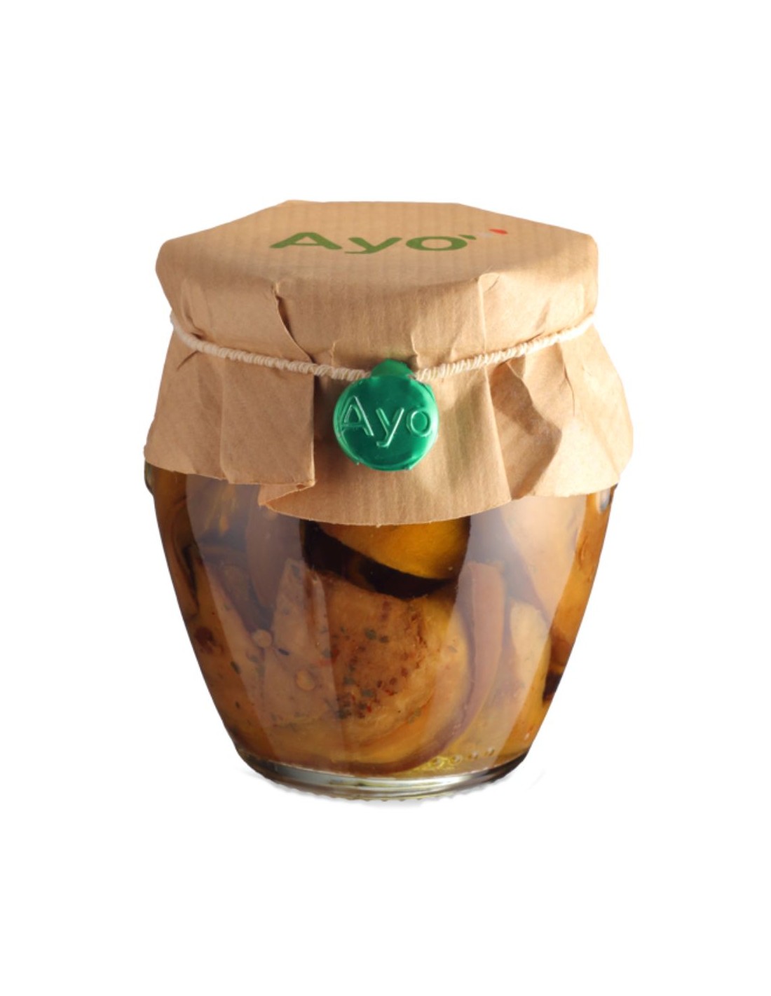 Le melanzane, tagliate a fette vengono conservate in olio con origano e peperoncino, che conferiscono loro un gusto fresco e delizioso. Sono ottime come contorno per carni e formaggi, come antipasto o spuntino.