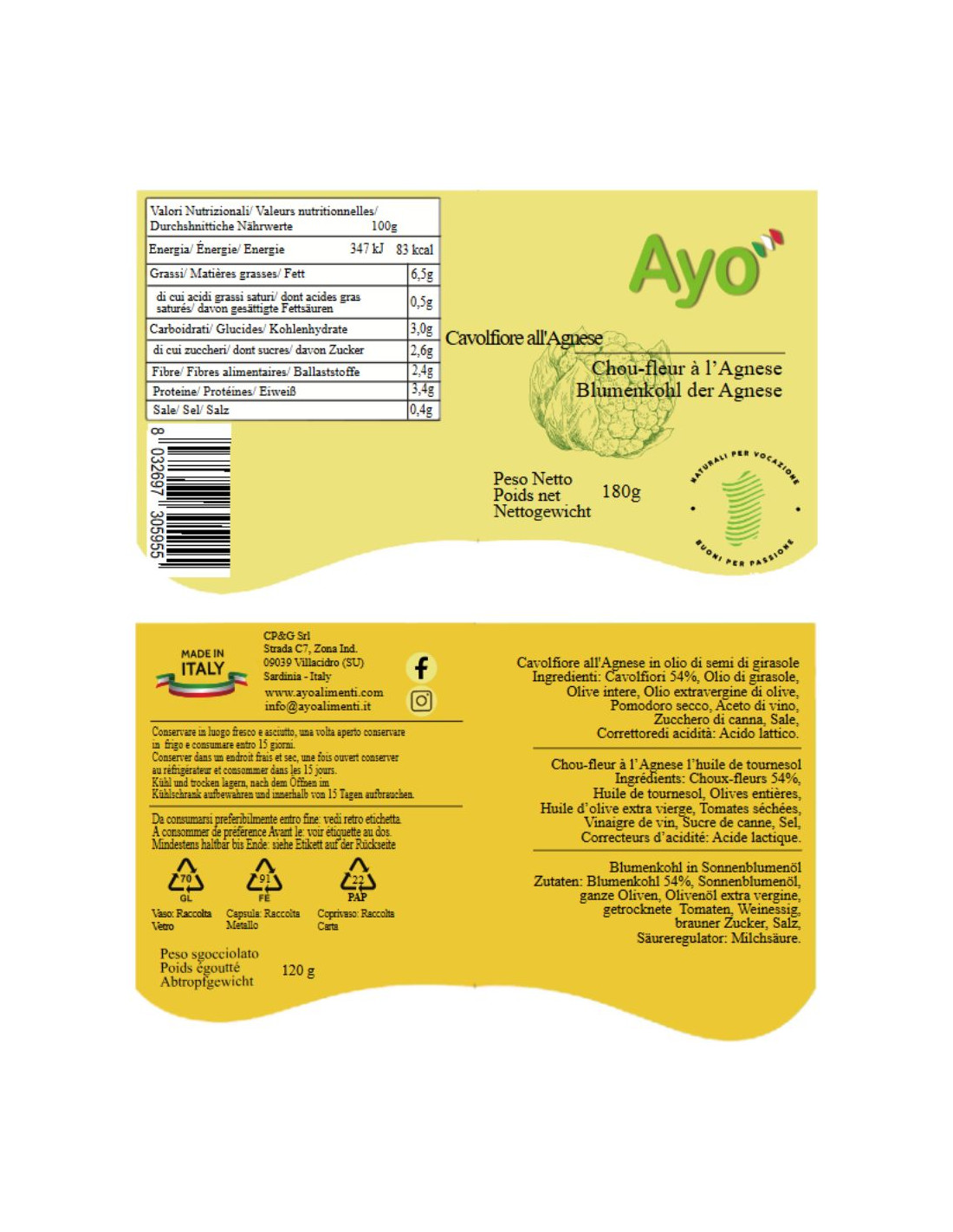 Cavolfiore 62%, Olio di semi di girasole, Olio extravergine di oliva, Olive, Pomodoro secco, Aceto di vino, Sale, Zucchero. Correttore di acidità: Acido lattico.