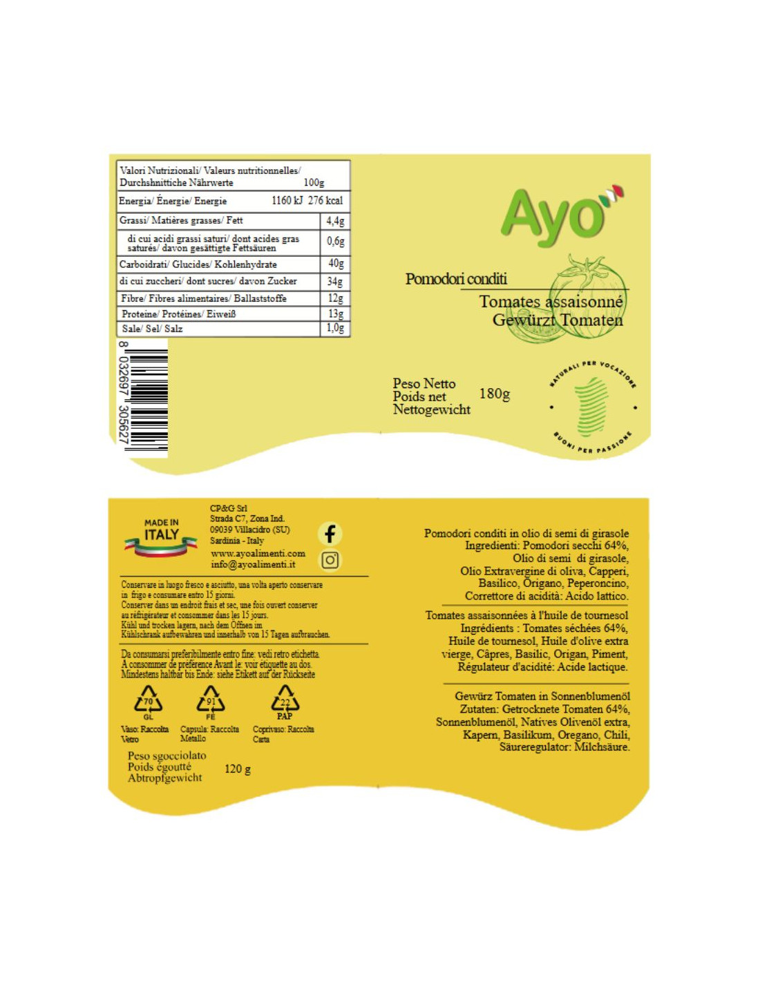 Pomodori essiccati 64%, Olio di semi di girasole, Olio extravergine di oliva, Capperi, Basilico, Origano, Peperoncino. Correttore di acidità: Acido lattico.